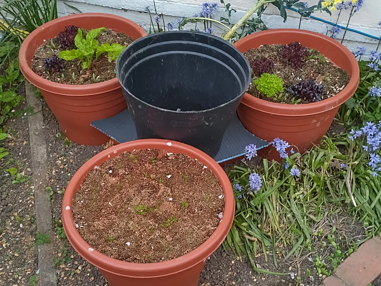 This was not planned. Once the three planters were in position, there was an obvious space in the centre where they all meet. A plain black pot fitted neatly on top of the three troughs.
